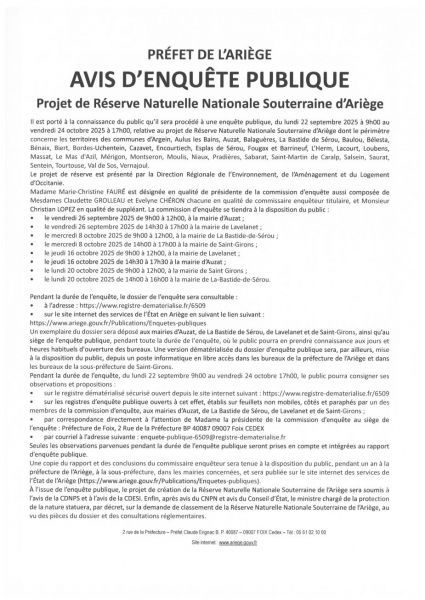 Avis d'enquête publique relative au projet de Réserve Naturelle Nationale Souterraine d'Ariège
